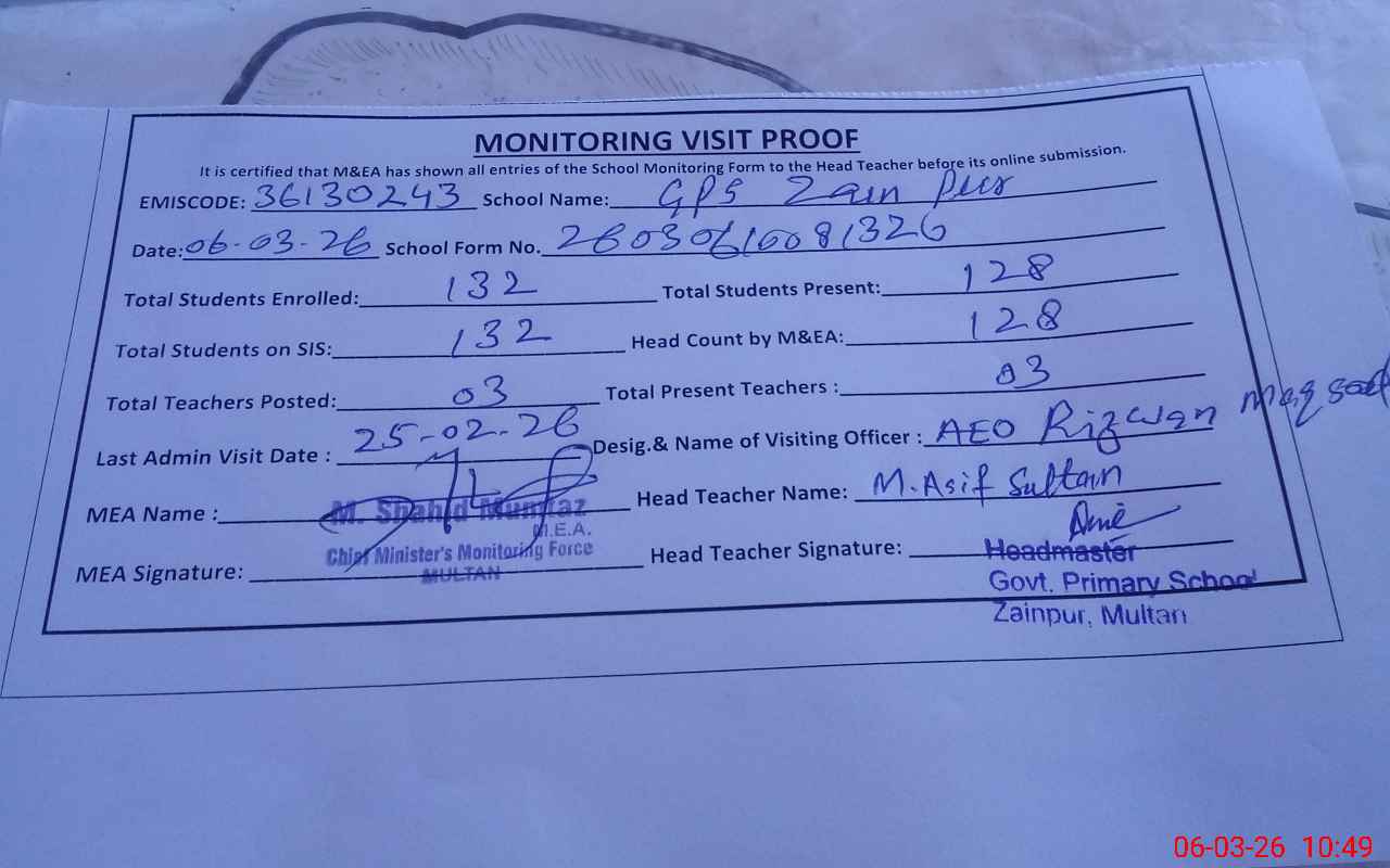 | EMIS Code: 36130243 | Name of School: GPS ZAIN PUR CHAH WADA KHOH MULTAN | |||