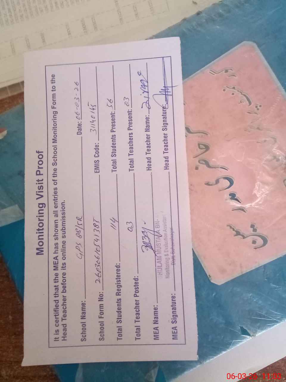 | Attendance Register | Head Teacher | MEA with School | Visit Proof |