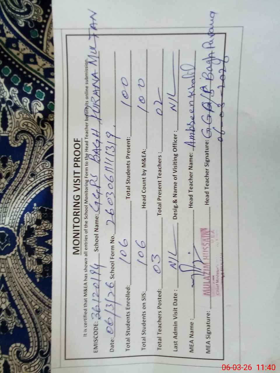 | Certified that this School was Inspected by the Undersigned MEA/DMO Today and the Information Stated Above is as Per Record. | |||||