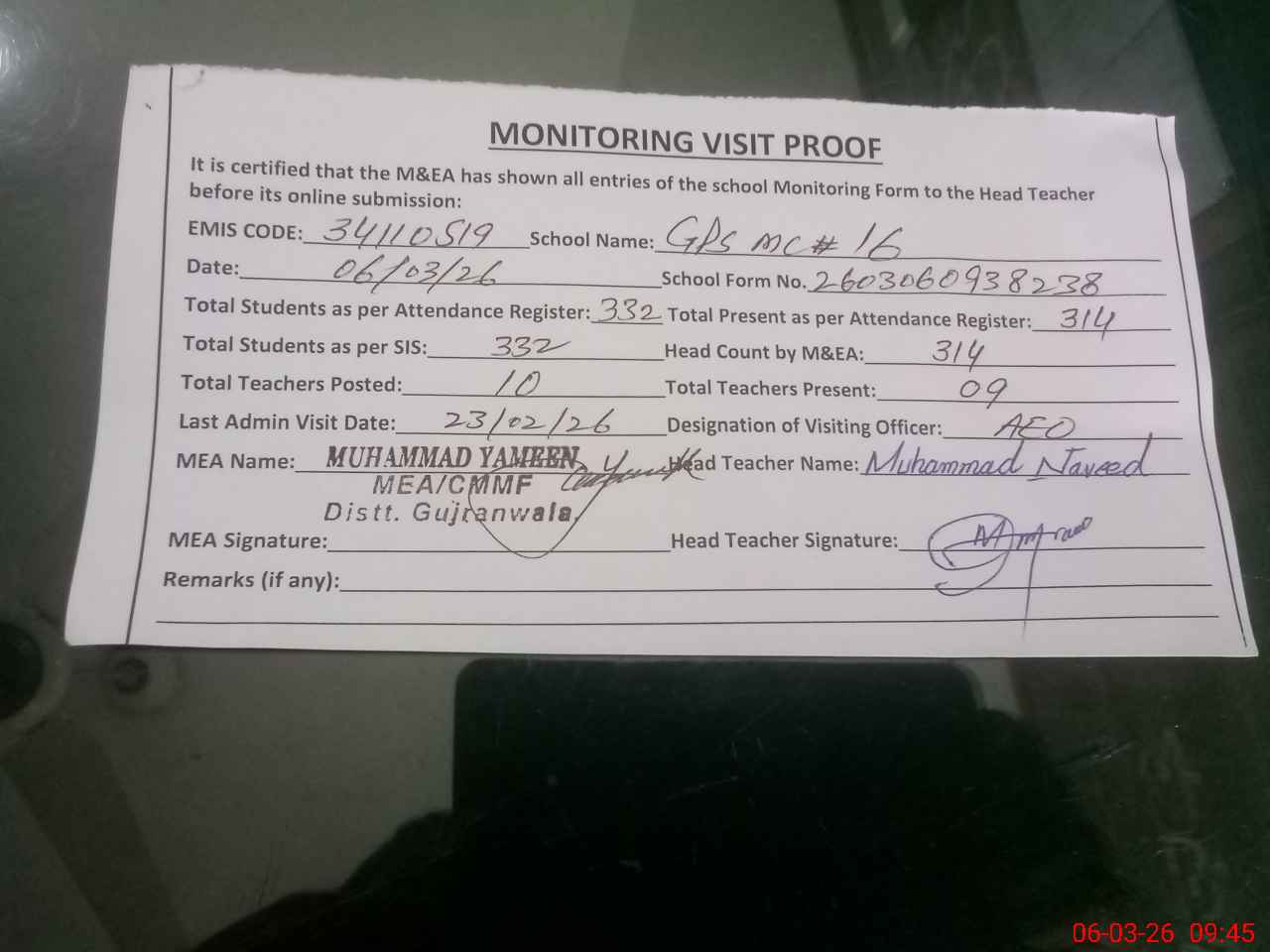 | EMIS Code: 34110519 | Name of School: GPS MC NO.16 FARID TOWN | |||