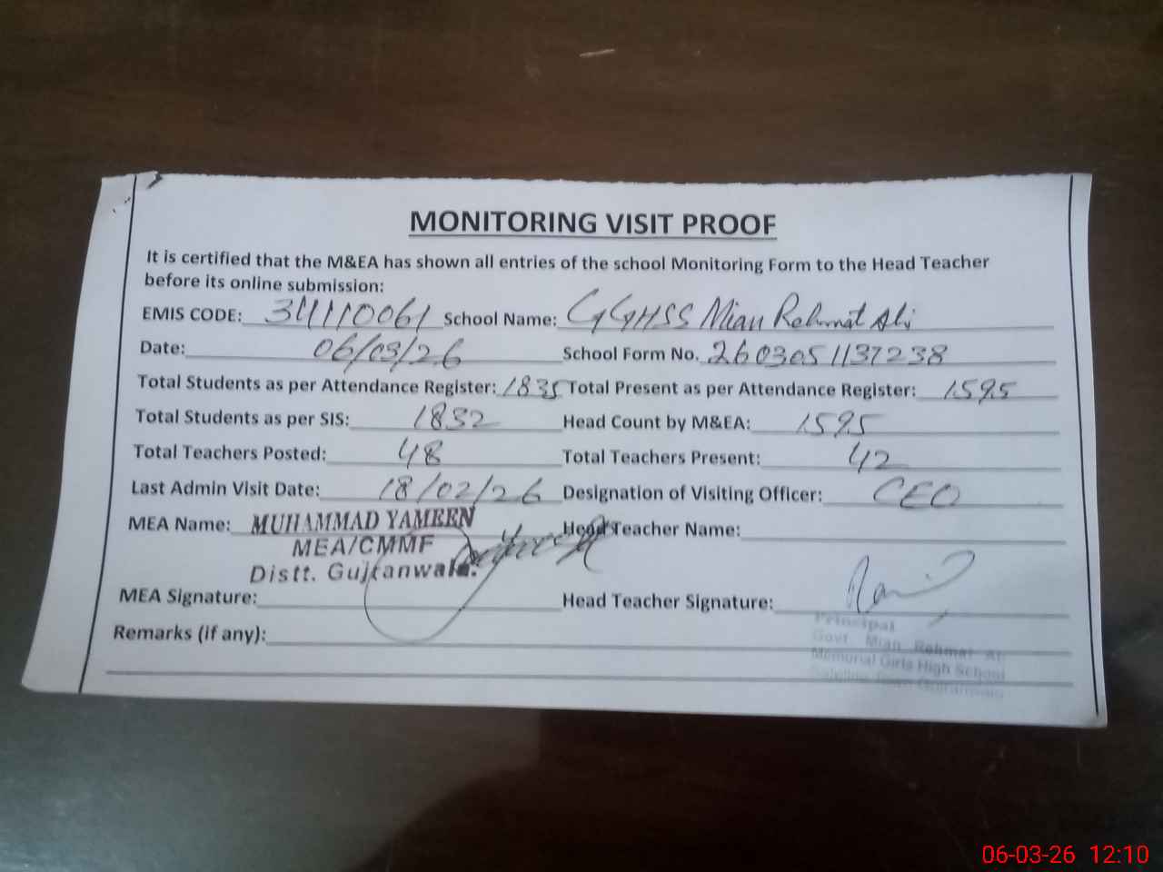 | Attendance Register | Head Teacher | MEA with School | Visit Proof |