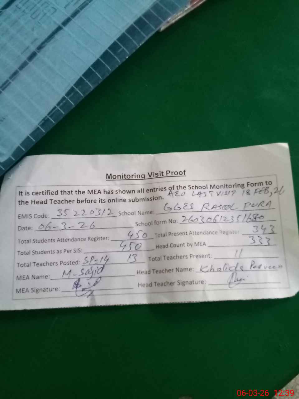 | Attendance Register | Head Teacher | MEA with School | Visit Proof |