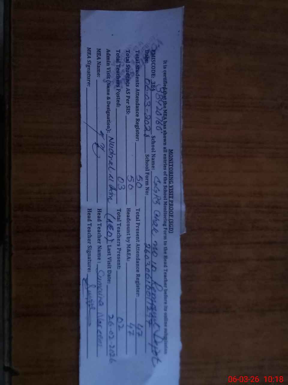 | Attendance Register | Head Teacher | MEA with School | Visit Proof |