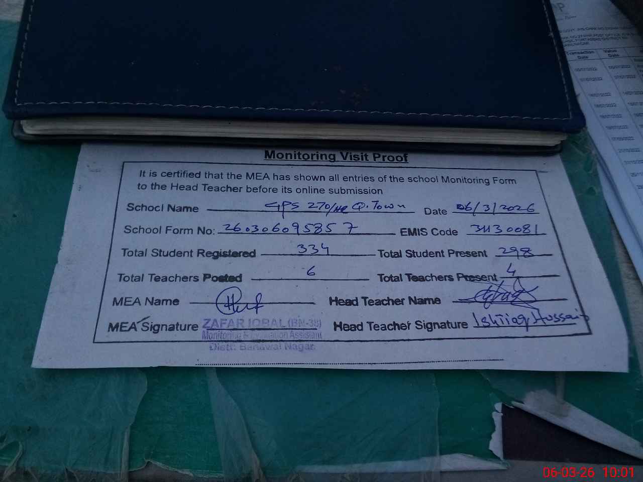 | Monitoring Date: 06-03-2026 | Start Time: 06-03-2026 09:40 AM | End Time: 06-03-2026 10:03 AM | Name of MEA: Za**** Iq**** BN**** | |