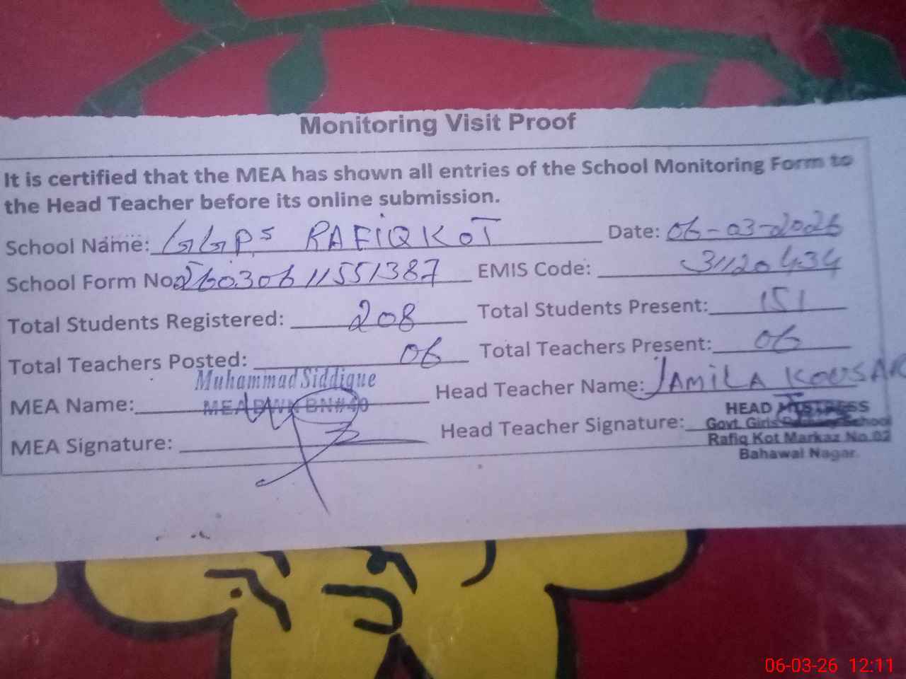 | Attendance Register | Head Teacher | MEA with School | Visit Proof |