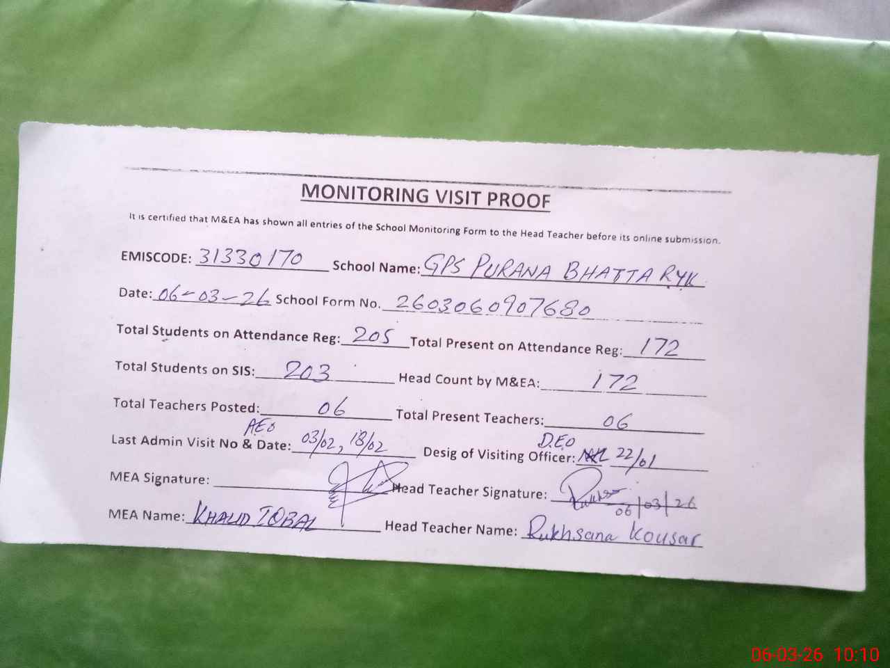 | Monitoring Date: 06-03-2026 | Start Time: 06-03-2026 09:07 AM | End Time: 06-03-2026 10:11 AM | Name of MEA: Kh**** Iq**** | |