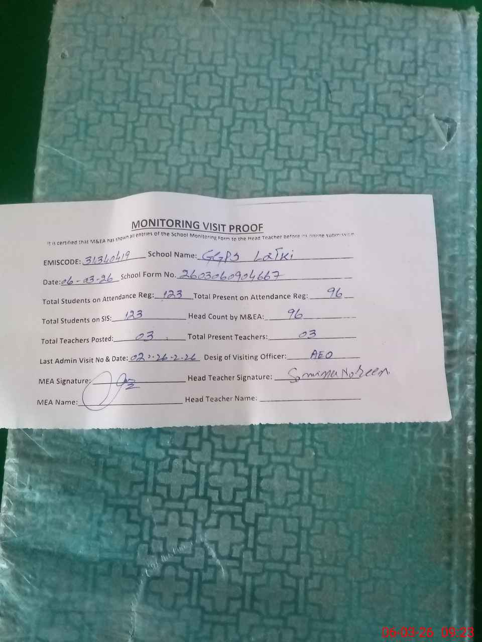 | Attendance Register | Head Teacher | MEA with School | Visit Proof |