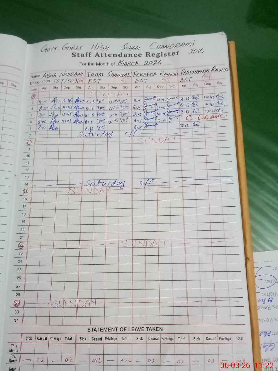 | Leave | Duty | Absent | Maternity | Medical | Ex- Pak |