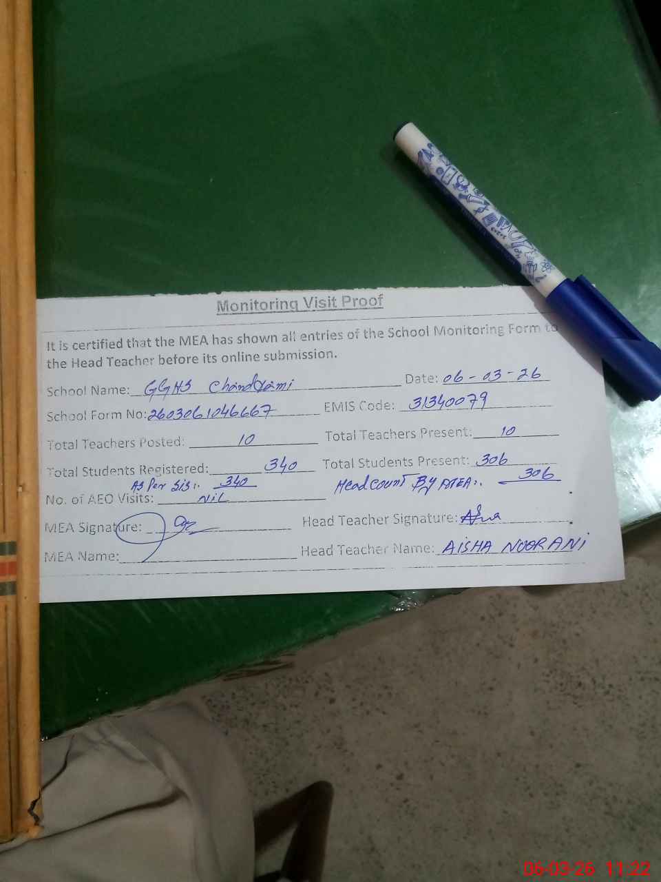 | Attendance Register | Head Teacher | MEA with School | Visit Proof |