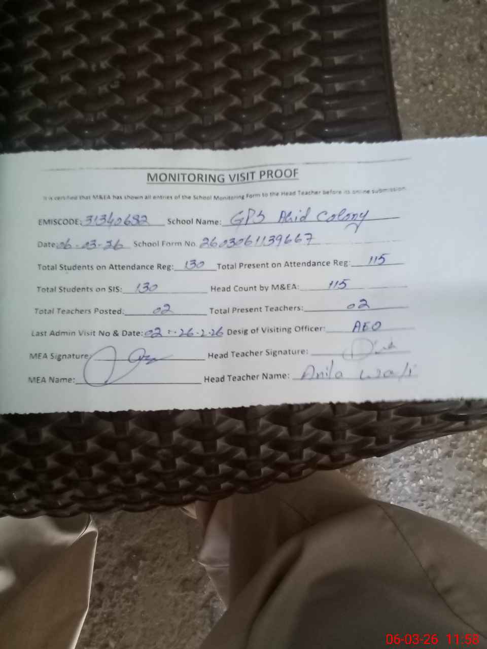 | Attendance Register | Head Teacher | MEA with School | Visit Proof |