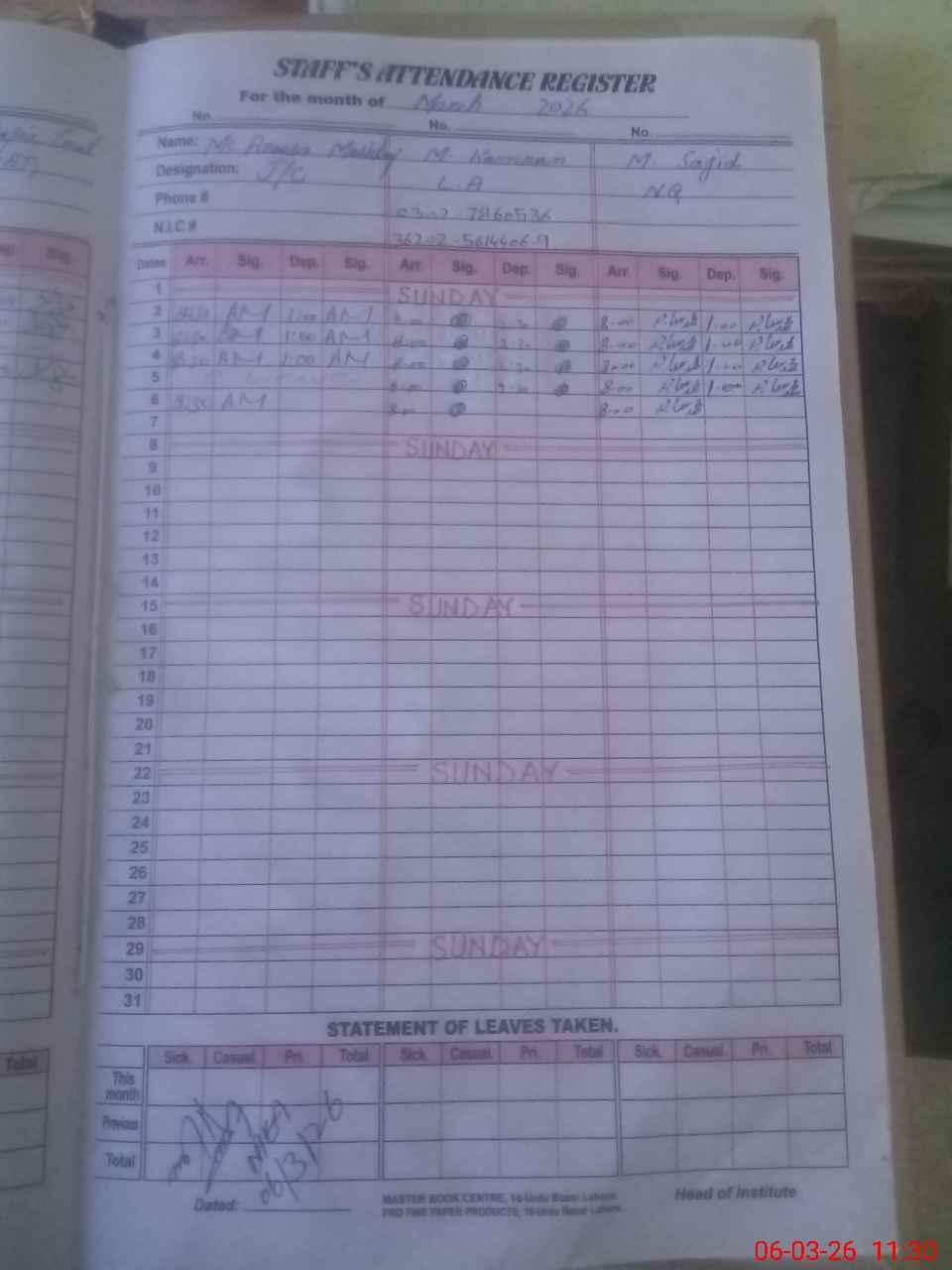 | CNIC | Full Name | Designation | R/C | Absence During Last Calender Month |
