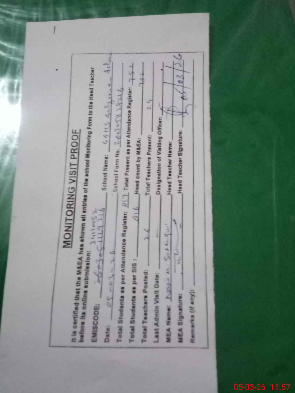 | Attendance Register | Head Teacher | MEA with School | Visit Proof |