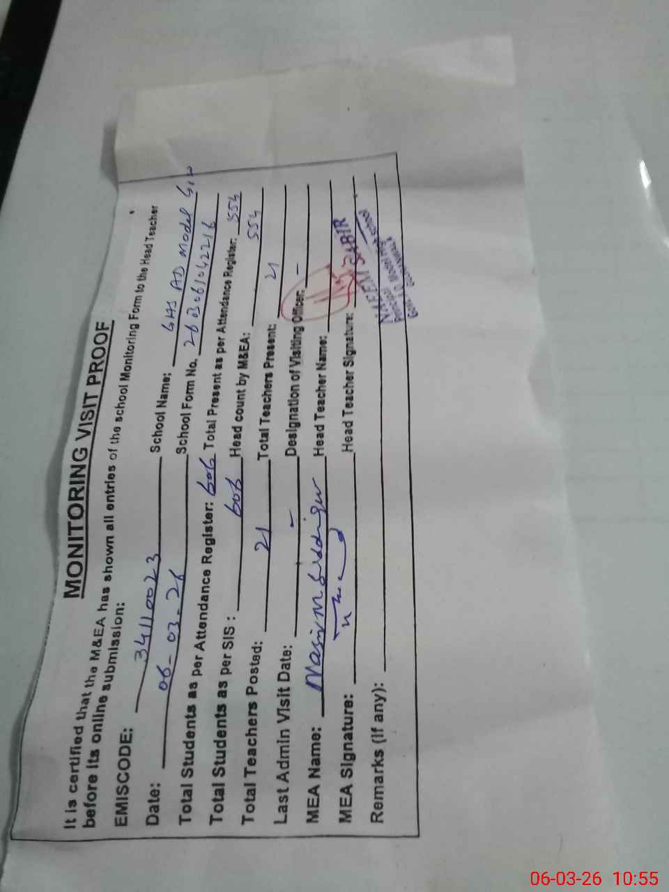 | Attendance Register | Head Teacher | MEA with School | Visit Proof |