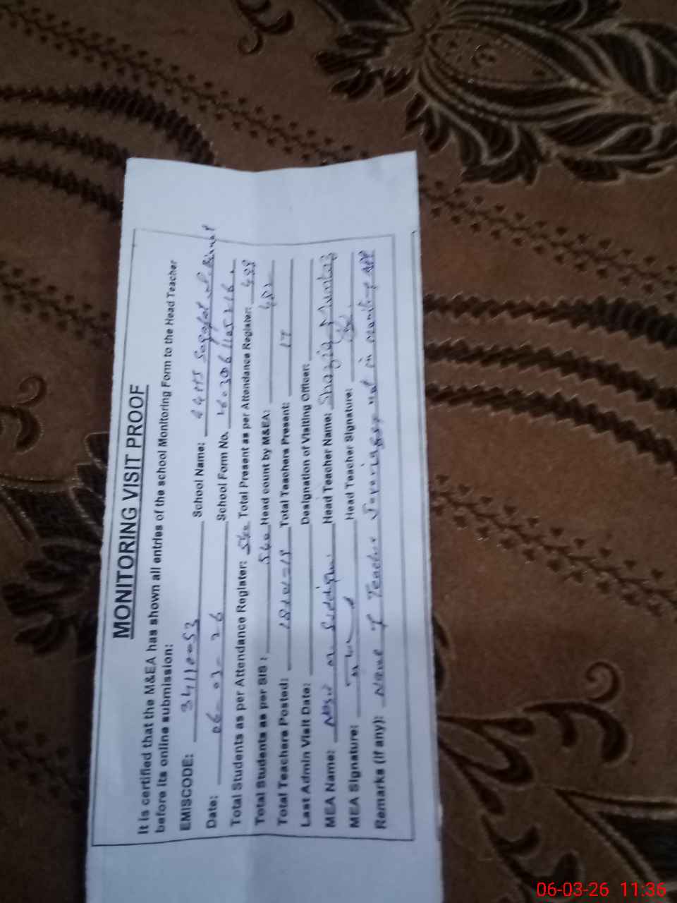 | Attendance Register | Head Teacher | MEA with School | Visit Proof |