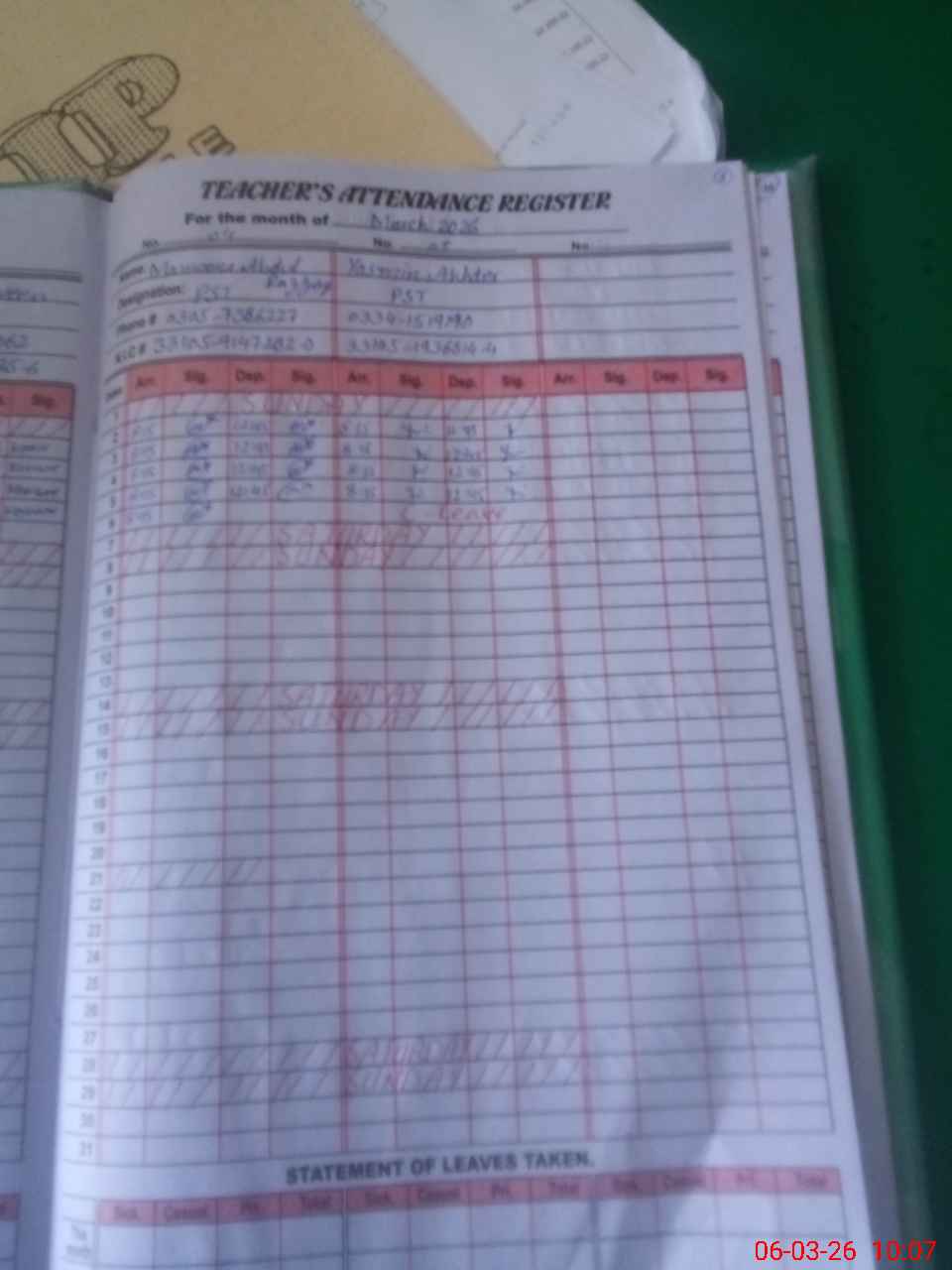 | Remarks (Use Separate Page if Required): STUDENT ROZNAMCHA NOT FILLED TODAY OUT OF 25 STUDENTS IN CLASS FIVE , TEN STUDENTS ARE PRESENT BUT ON CLASS REGISTER ALL STUDENTS MARKED PRESENT. YAMIN AKHTAR MARKED AS CASUAL LEAVE AND ALSO APPLIED FOR CASUAL LEAVE BY HEAD TEACHER RUKHSANA BUT ALL TEACHERS DON'T KNOW THE WHEREABOUT OF THE TEACHER YAMIN AKHTAR AS INFORMED BY THE HEADTEACHER. THIS MATTER ALSO INFORMED TO OFFICE SHAFAQAT SB. TEACHER KOUSAR PARVEEN PST HAS NO EDUCATION SERVICE CARD. | |||||