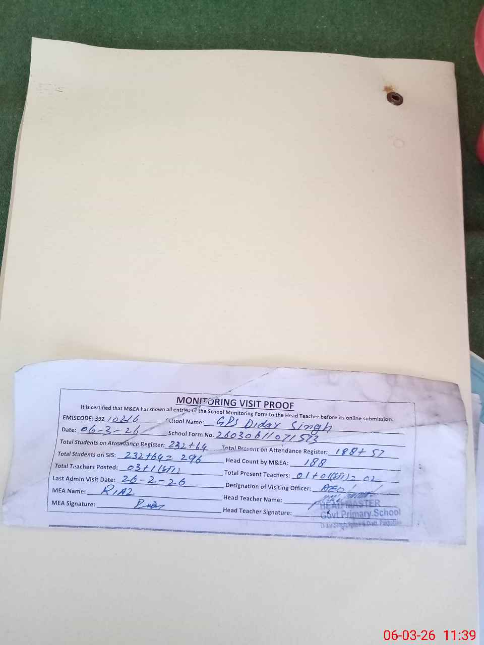 | Attendance Register | Head Teacher | MEA with School | Visit Proof |