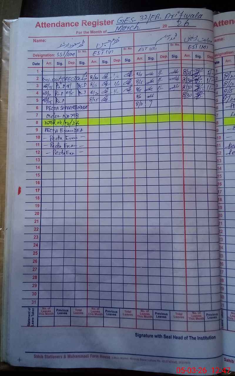 | CNIC | Full Name | Designation | R/C | Absence During Last Calender Month |