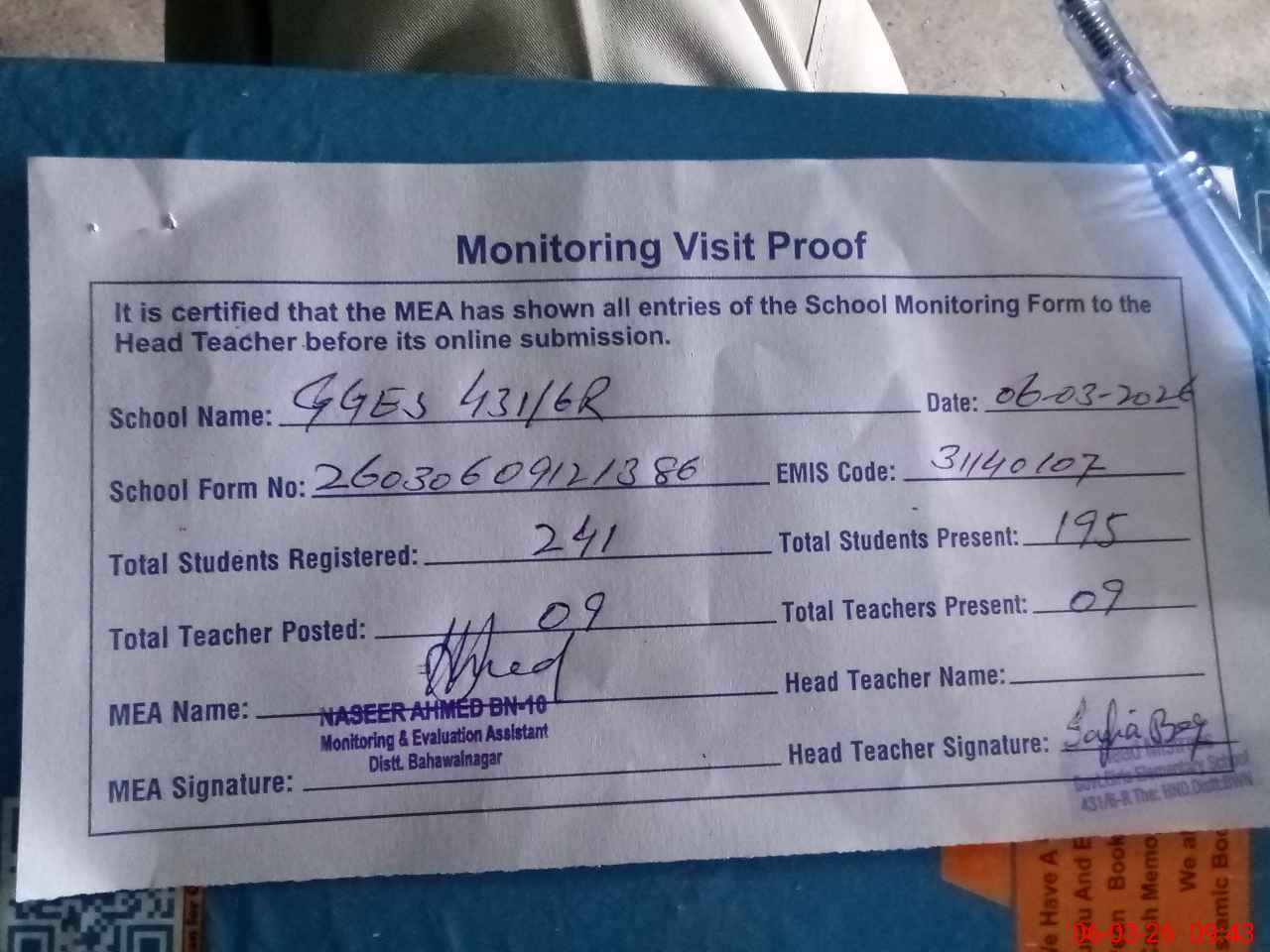 | EMIS Code: 31140107 | Name of School: GGES CHAK 431/6-R | |||
