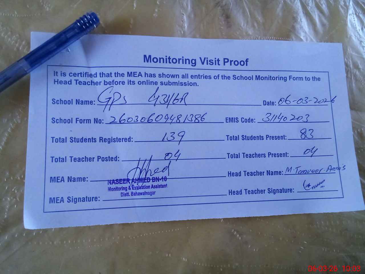 | Attendance Register | Head Teacher | MEA with School | Visit Proof |