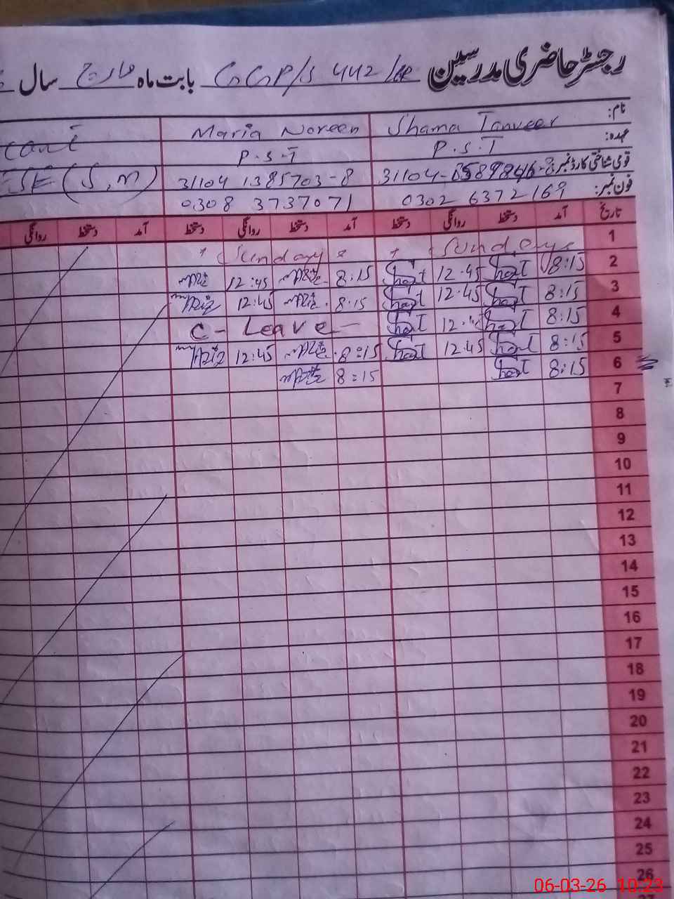 | CNIC | Full Name | Designation | R/C | Absence During Last Calender Month |