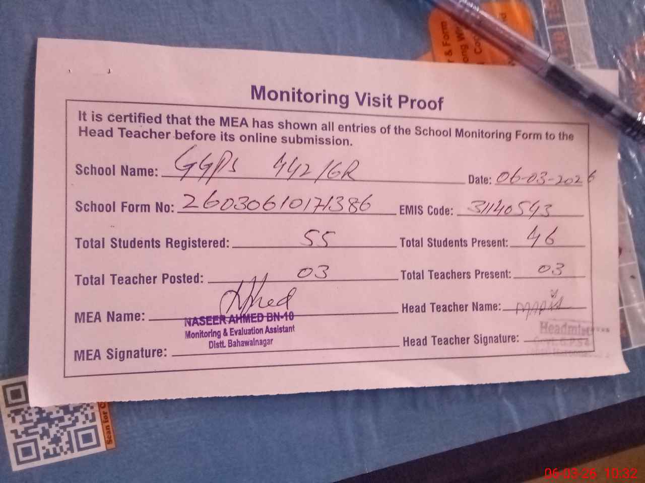 | Attendance Register | Head Teacher | MEA with School | Visit Proof |