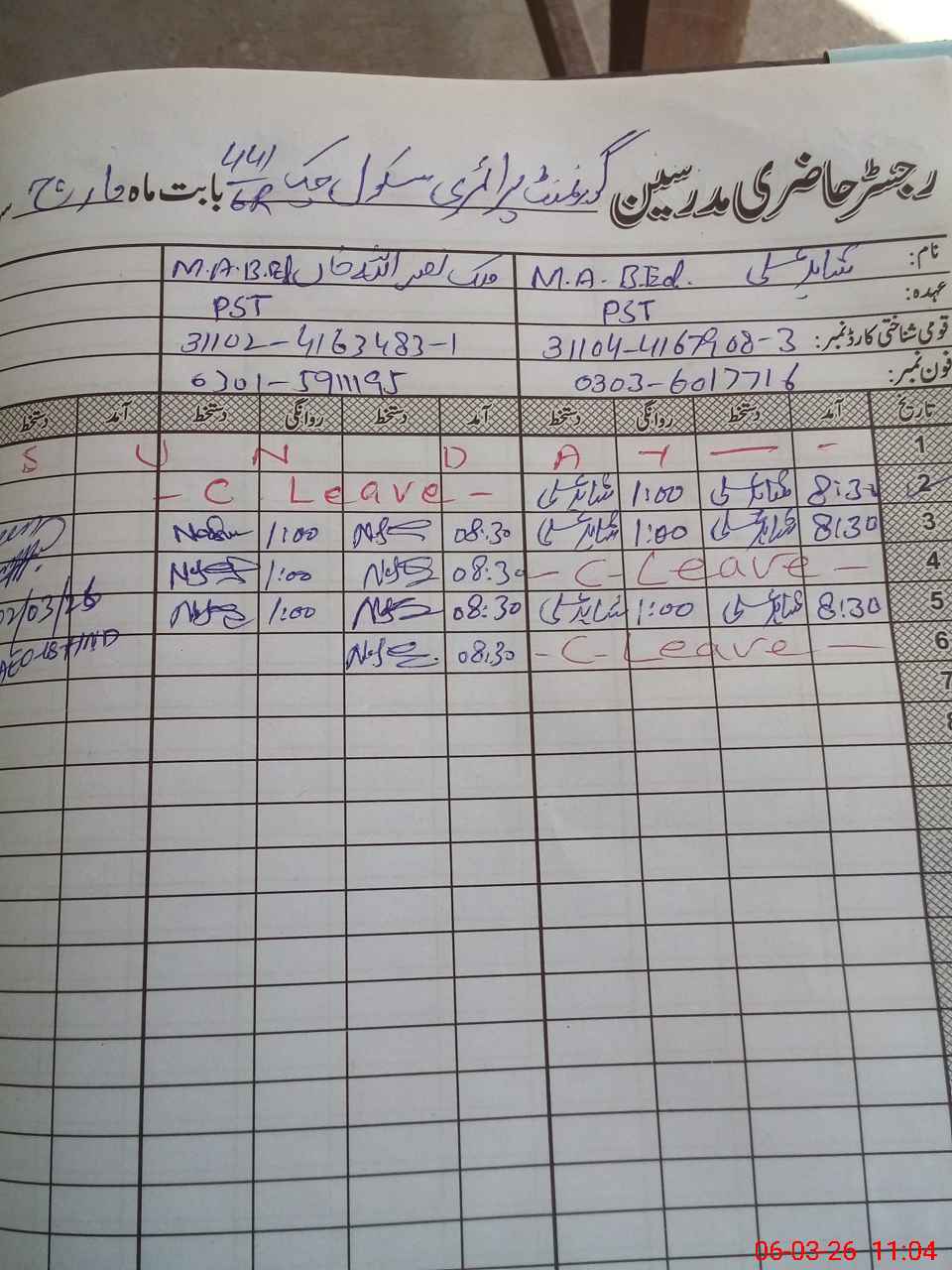 | Name: Sh**** Al**** Designation: (School Headmaster's/Headmistress's) PST Phone/Cell Number: 03**** |