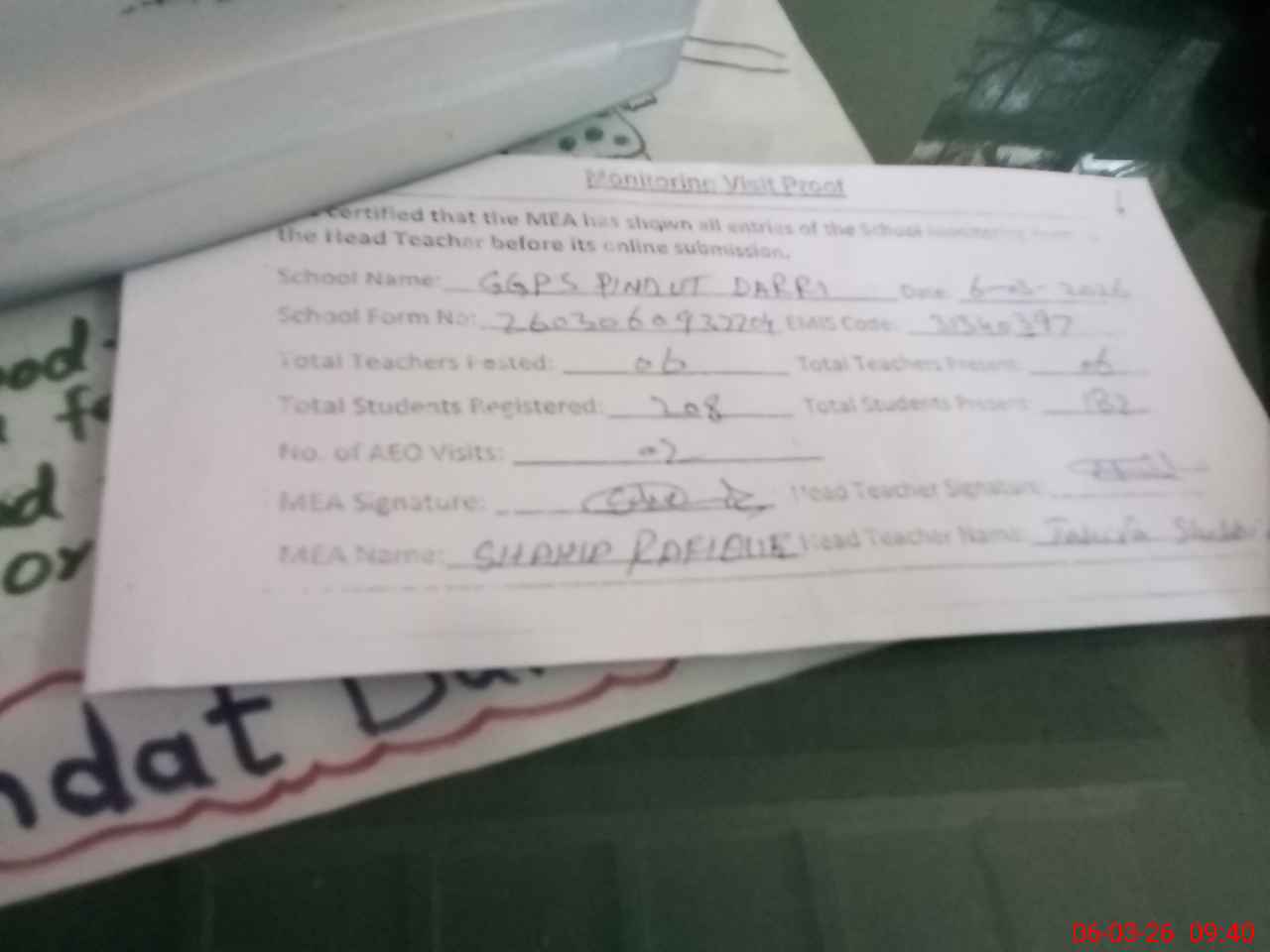 | Attendance Register | Head Teacher | MEA with School | Visit Proof |
