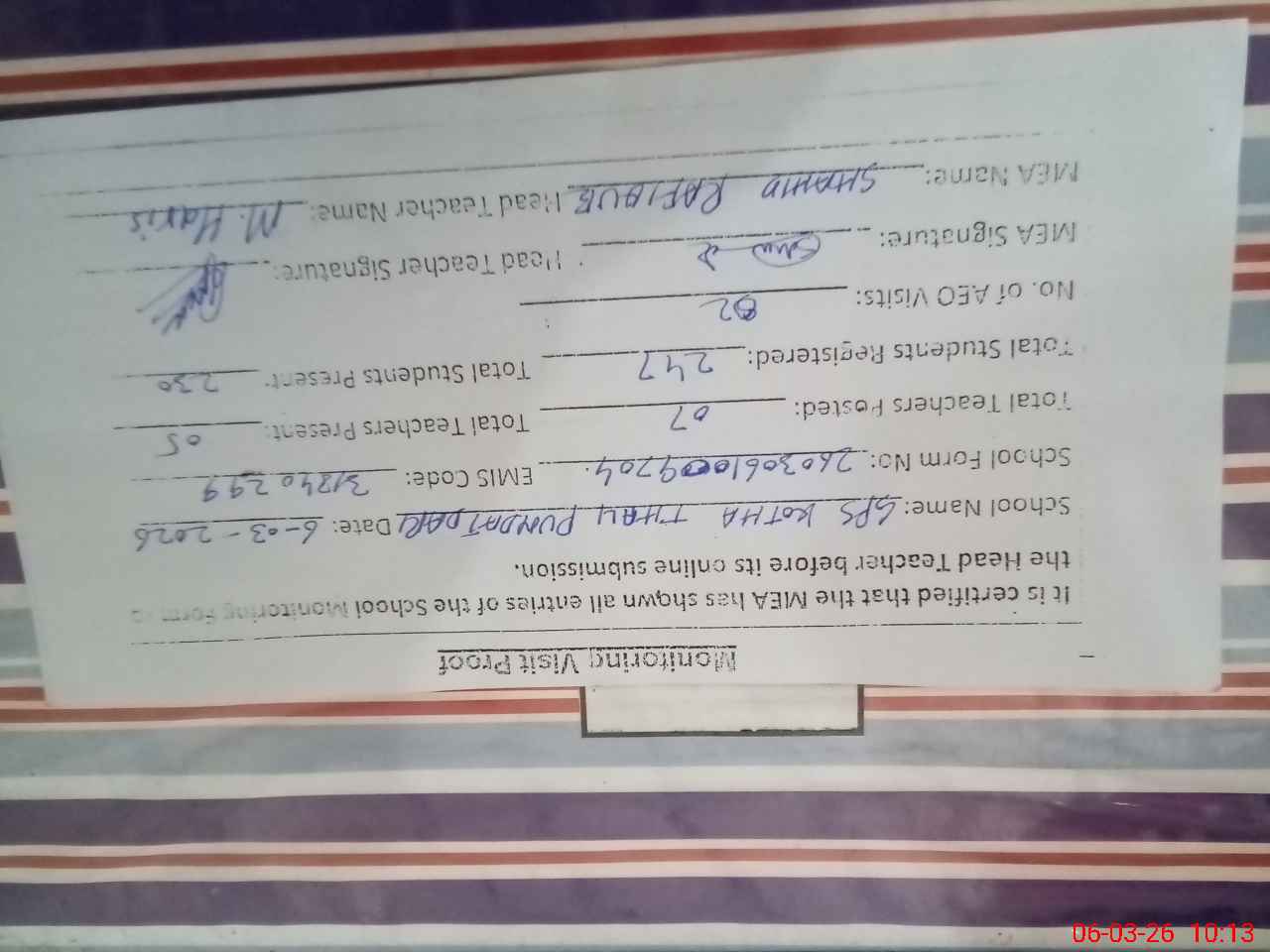 | Attendance Register | Head Teacher | MEA with School | Visit Proof |