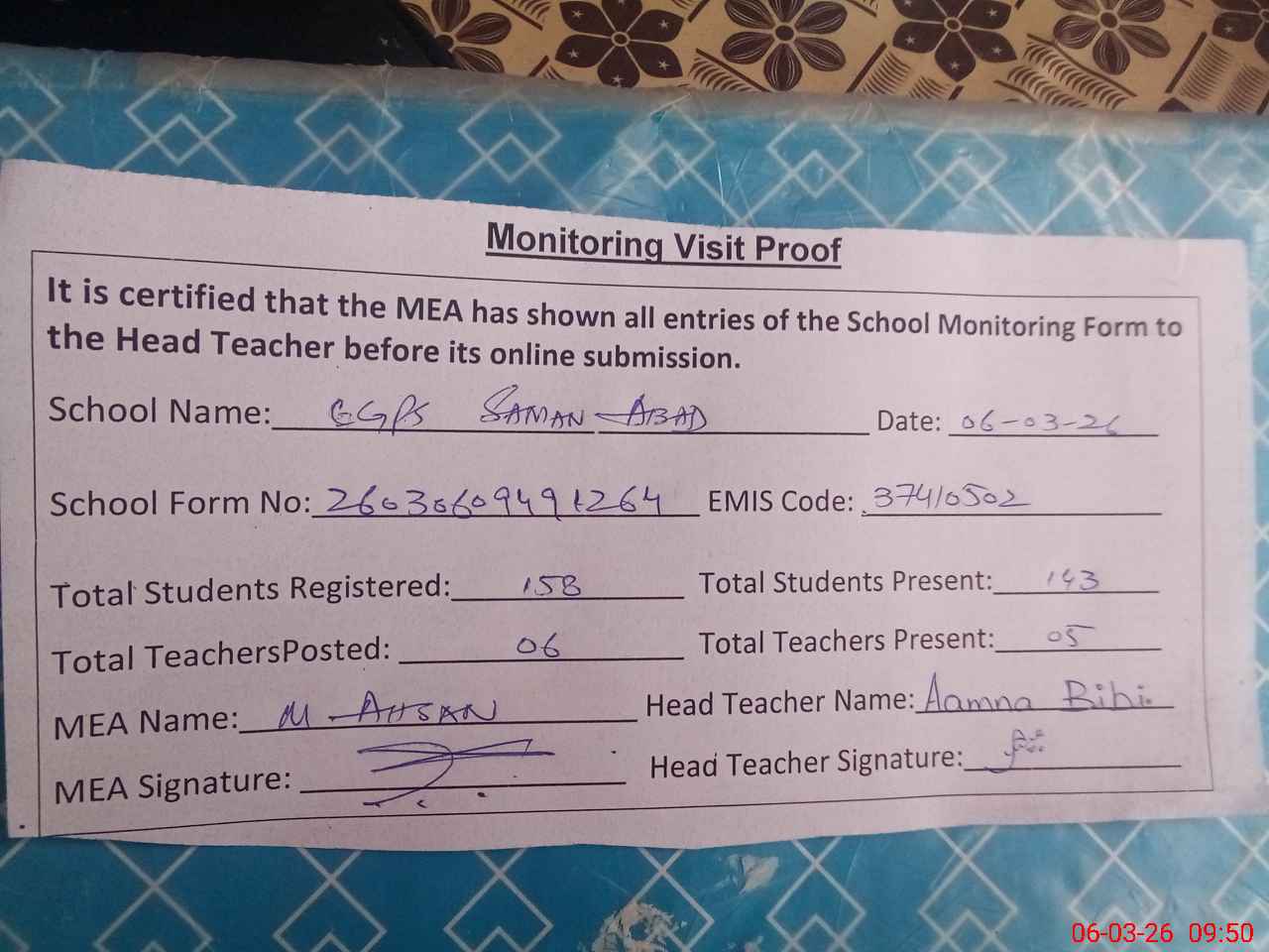 | Monitoring Date: 06-03-2026 | Start Time: 06-03-2026 09:02 AM | End Time: 06-03-2026 09:51 AM | Name of MEA: Mu**** Ah**** Ma**** | |