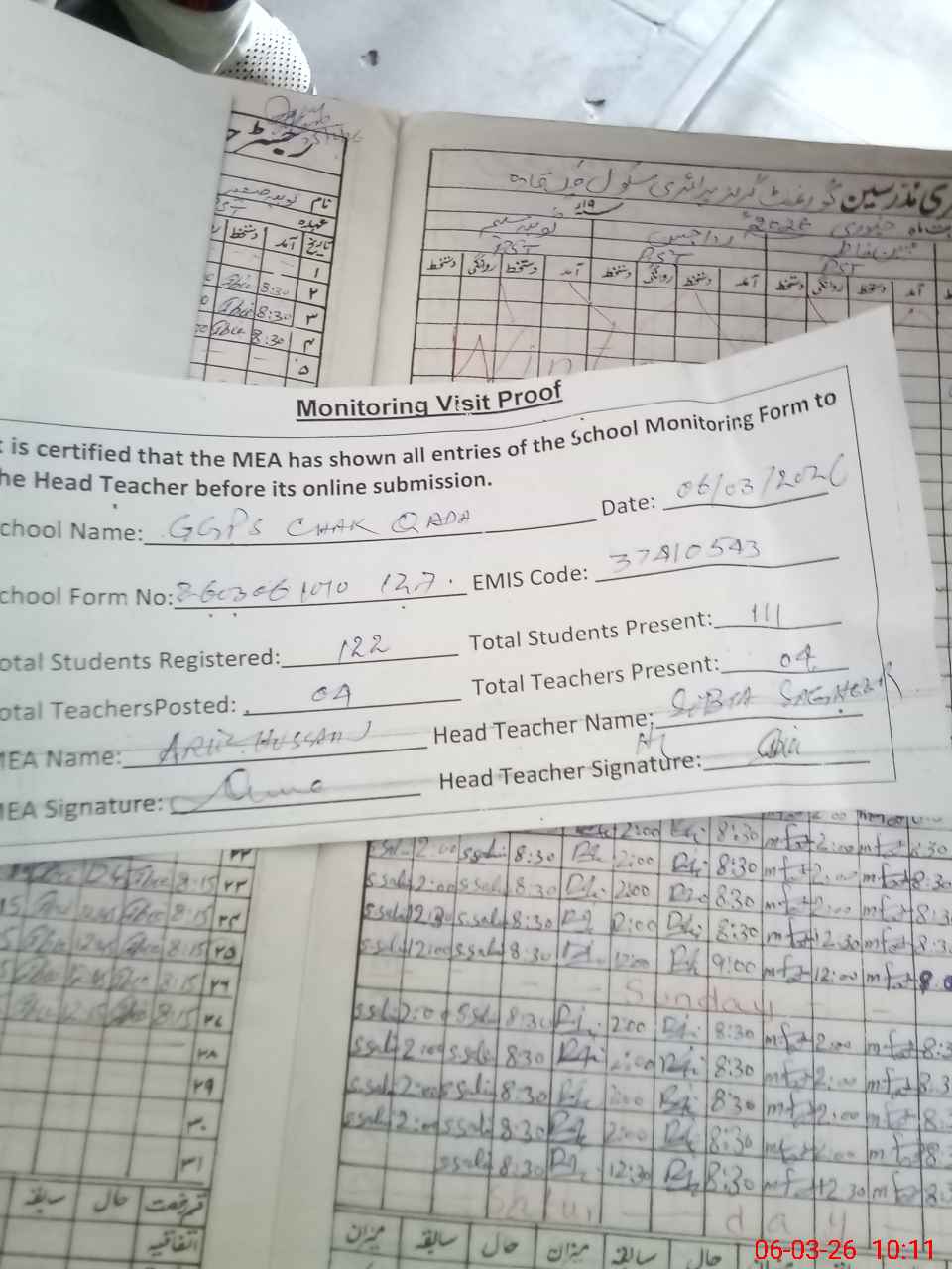 | Attendance Register | Head Teacher | MEA with School | Visit Proof |