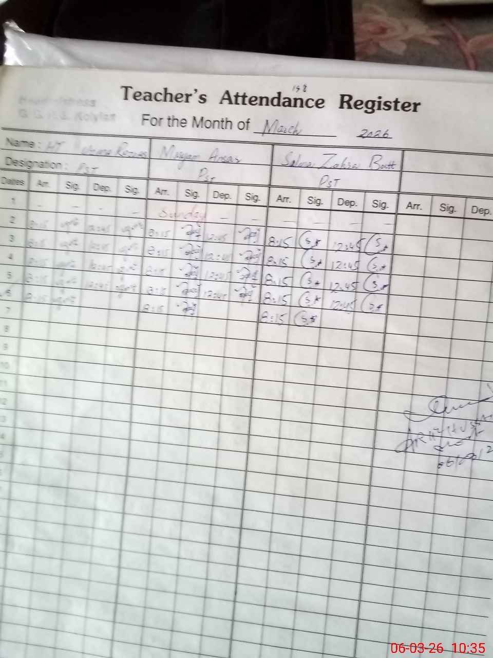 | Name: Uz**** Ra**** Designation: (School Headmaster's/Headmistress's) HEADMISTRESS Phone/Cell Number: 03**** |
