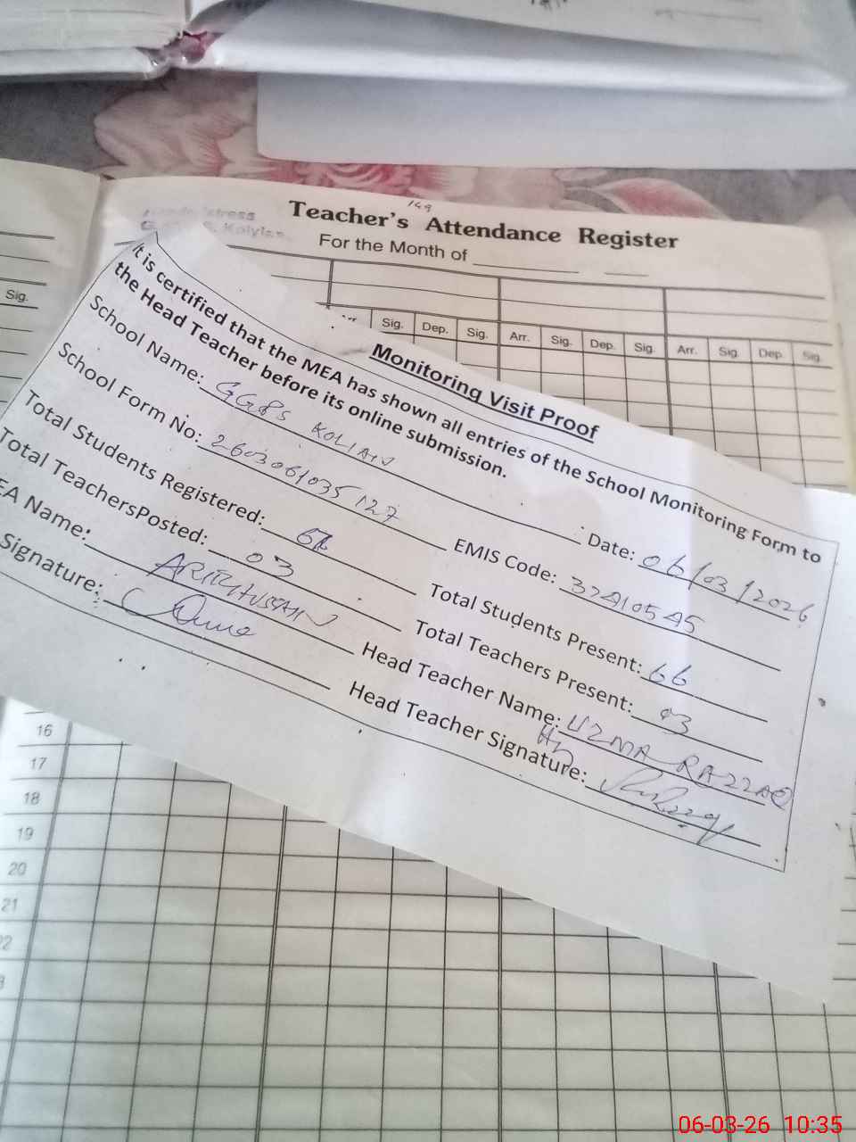| Attendance Register | Head Teacher | MEA with School | Visit Proof |
