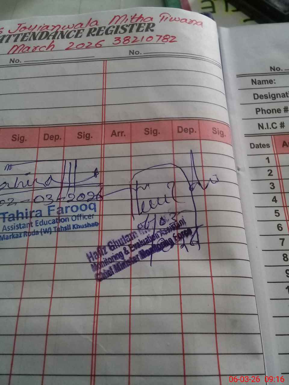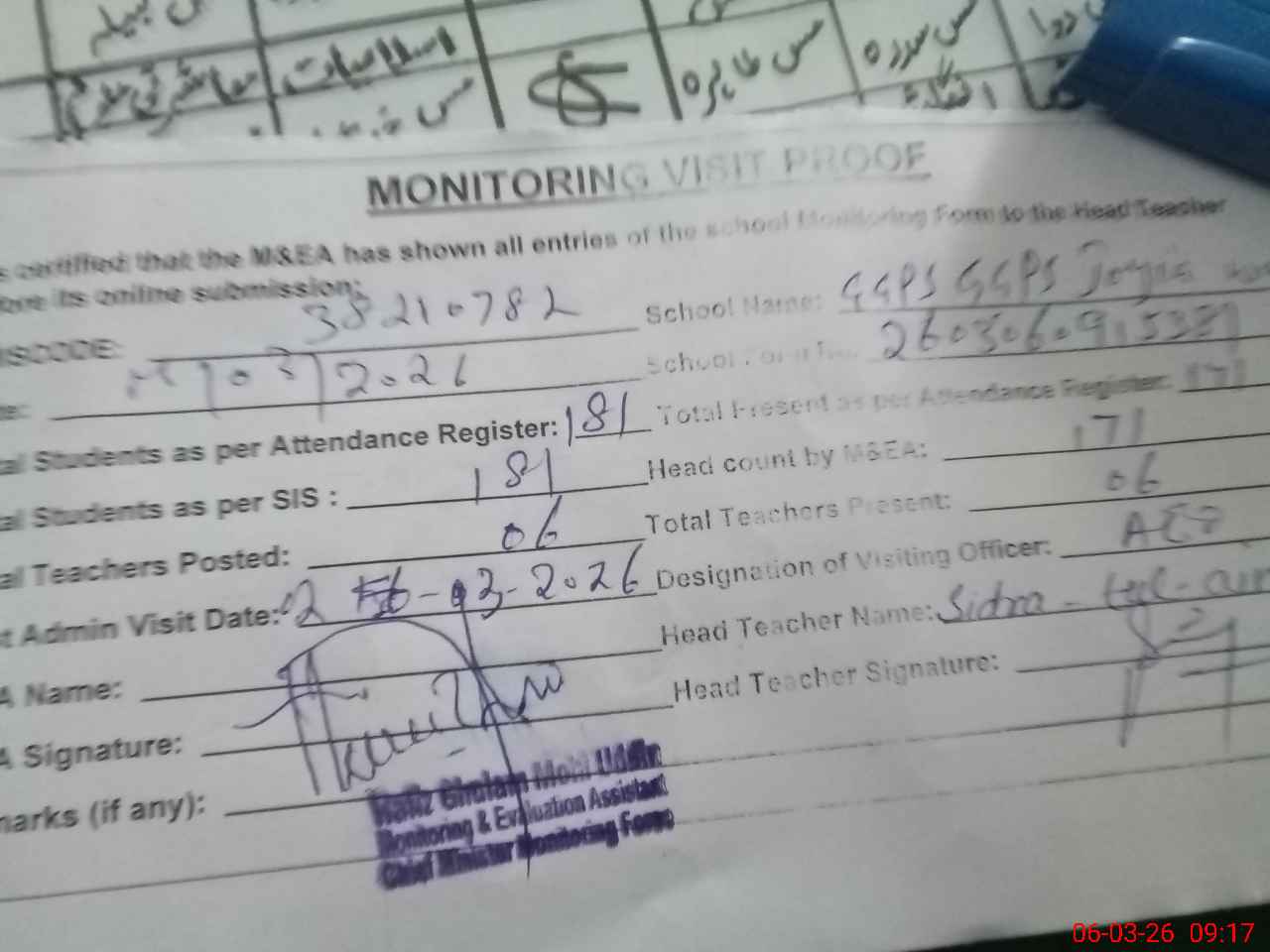 | Attendance Register | Head Teacher | MEA with School | Visit Proof |