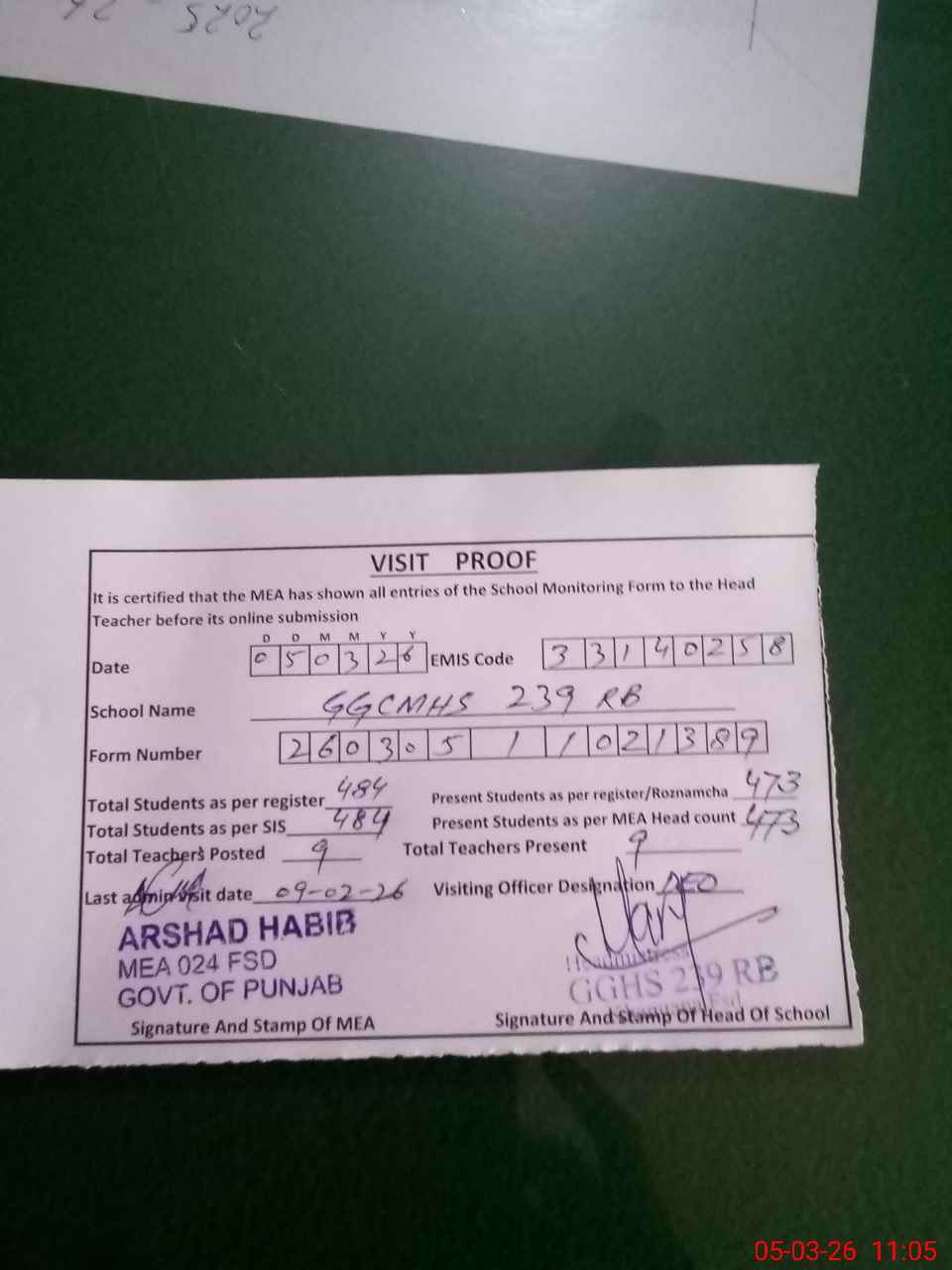 | EMIS Code: 33140258 | Name of School: GGCMHS CHAK NO. 239 RB | |||