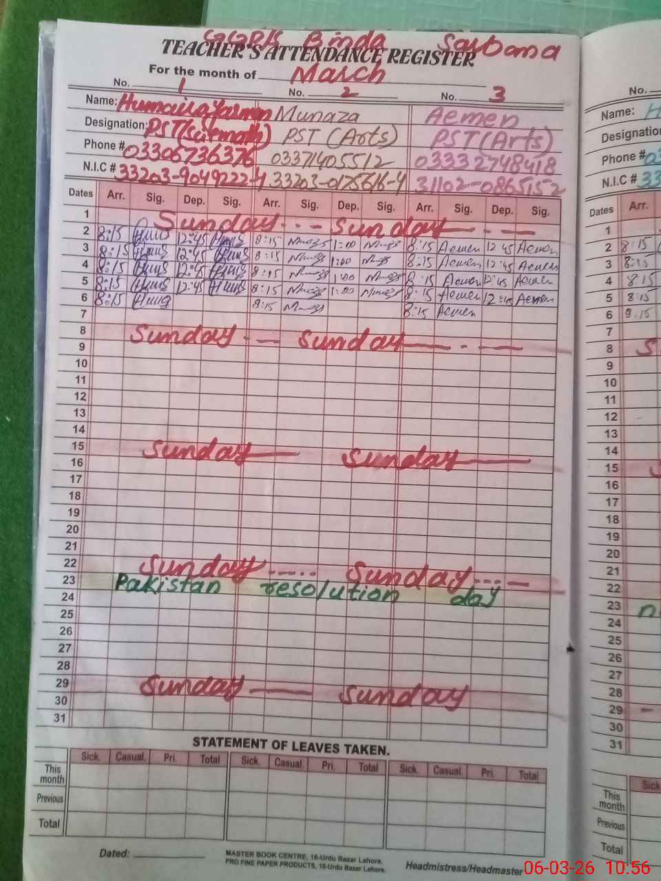| CNIC | Full Name | Designation | R/C | Absence During Last Calender Month |
