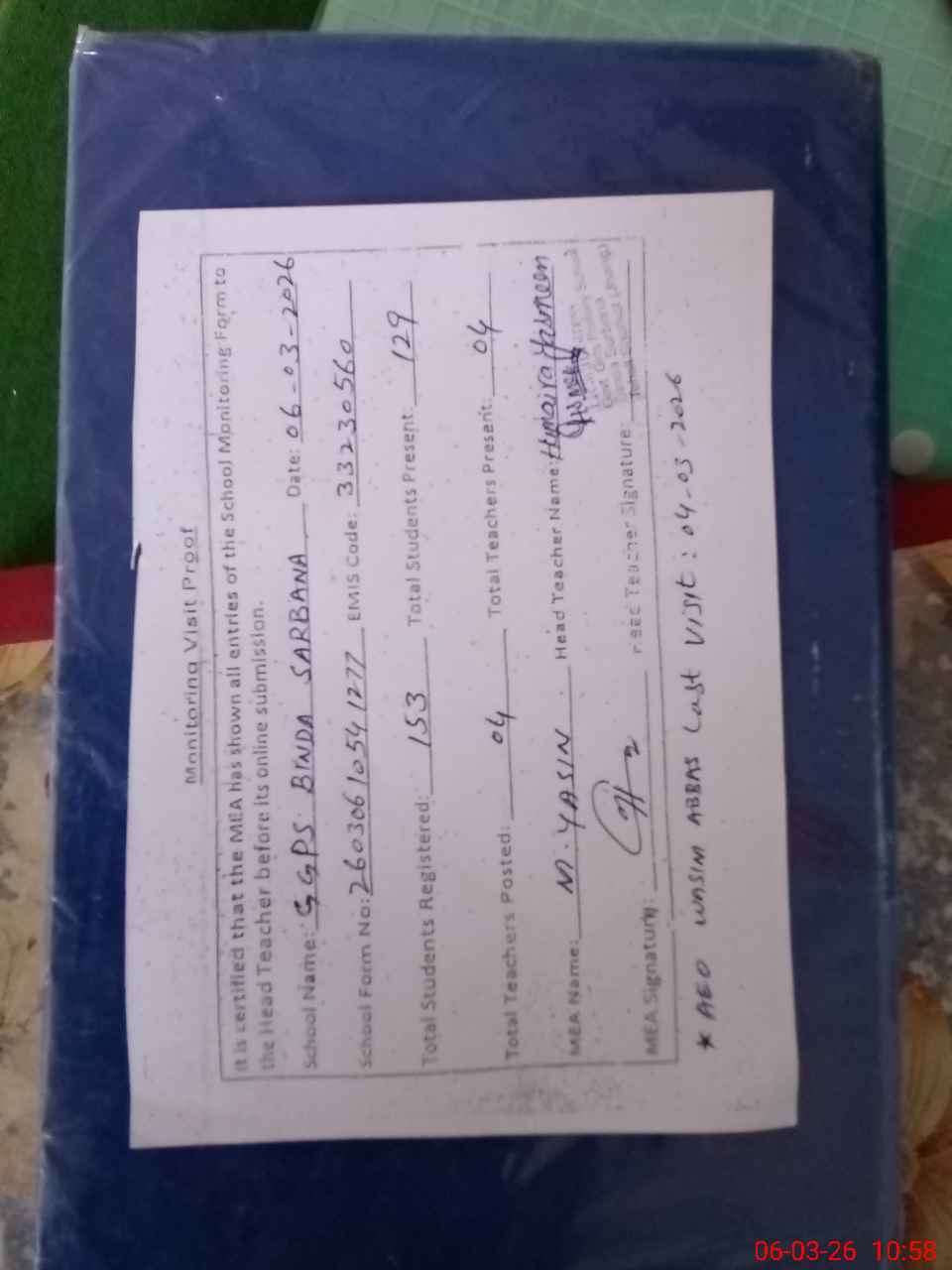 | Attendance Register | Head Teacher | MEA with School | Visit Proof |
