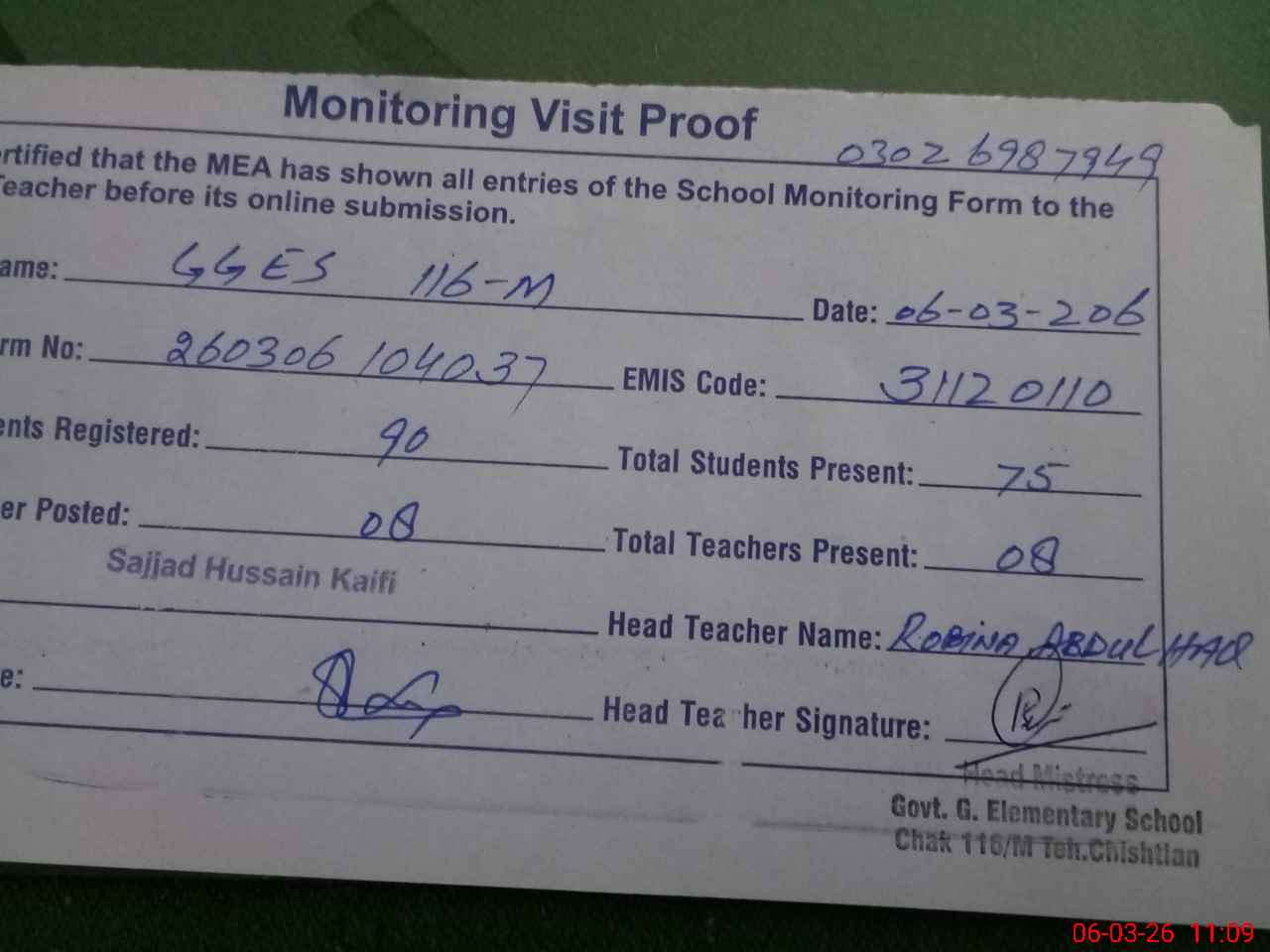 | EMIS Code: 31120110 | Name of School: GGES CHAK NO. 116/M | |||