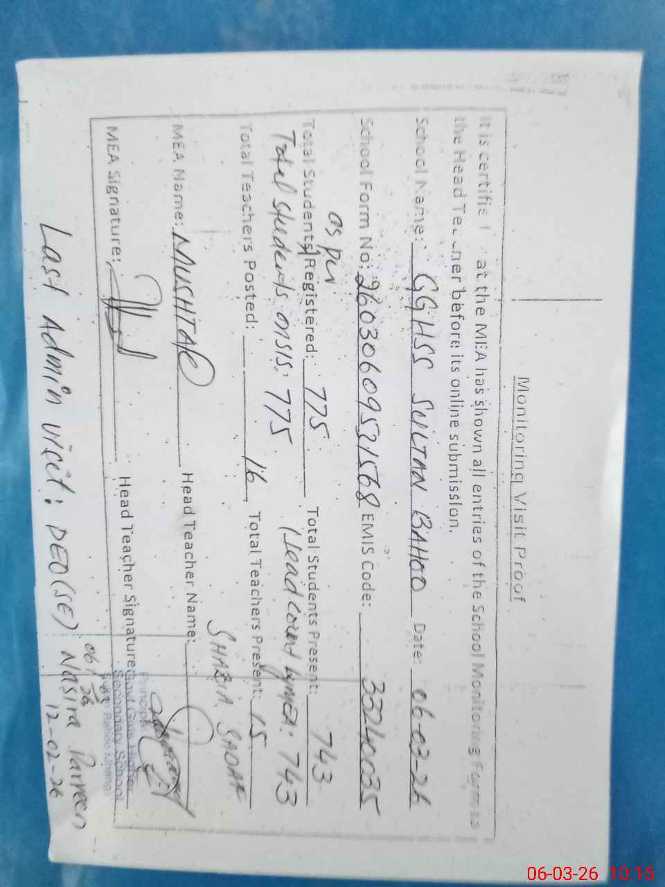 | EMIS Code: 33240035 | Name of School: GGHSS SULTAN BAHU | |||