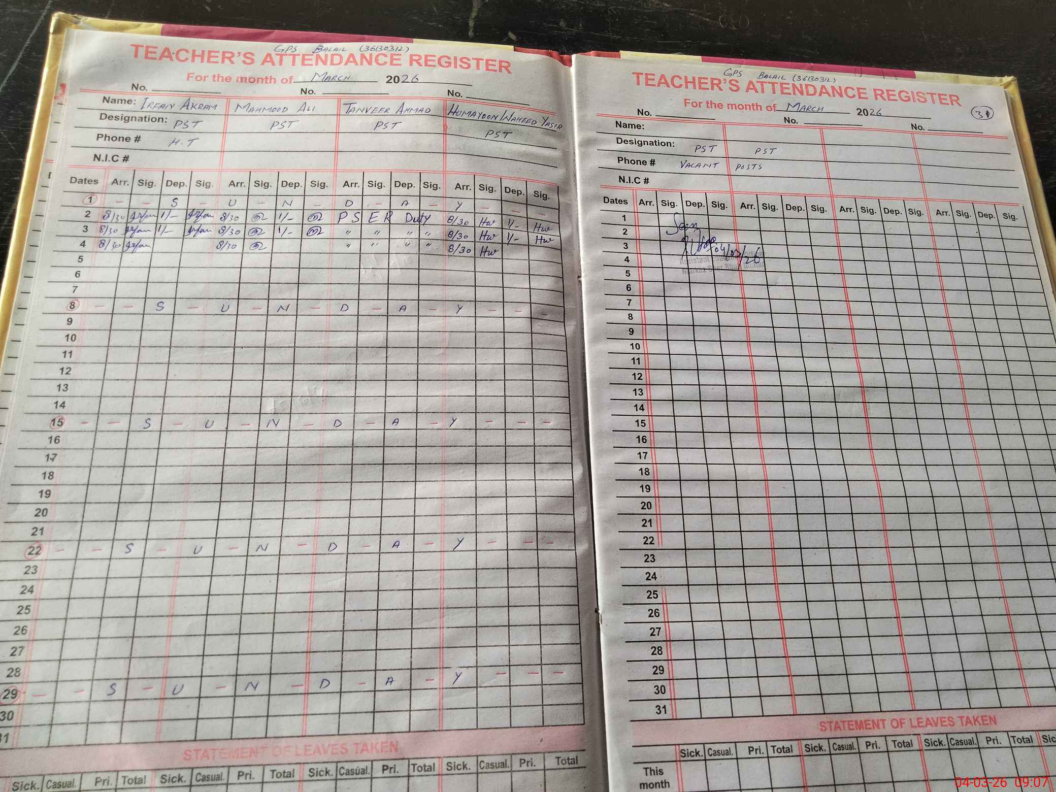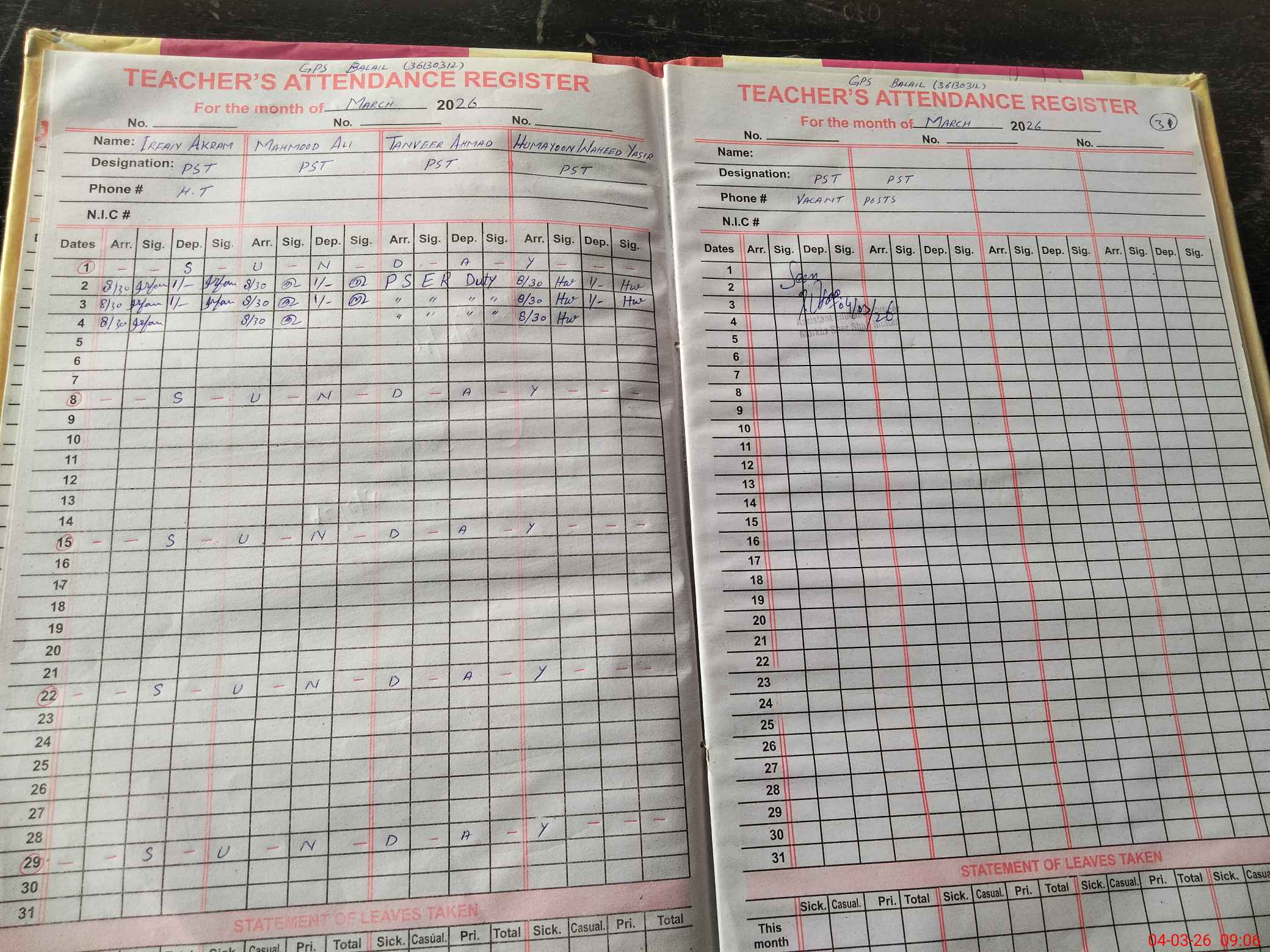 | Name: Ir**** Ak**** Designation: (School Headmaster's/Headmistress's) PST/ Phone/Cell Number: 03**** |