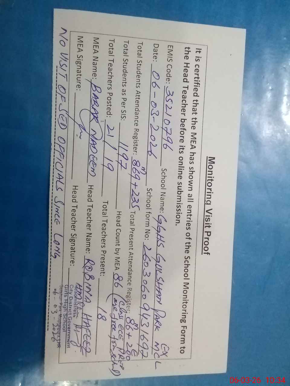 | EMIS Code: 35210796 | Name of School: GGHS GULSHAN PARK (EX-MCL) | |||