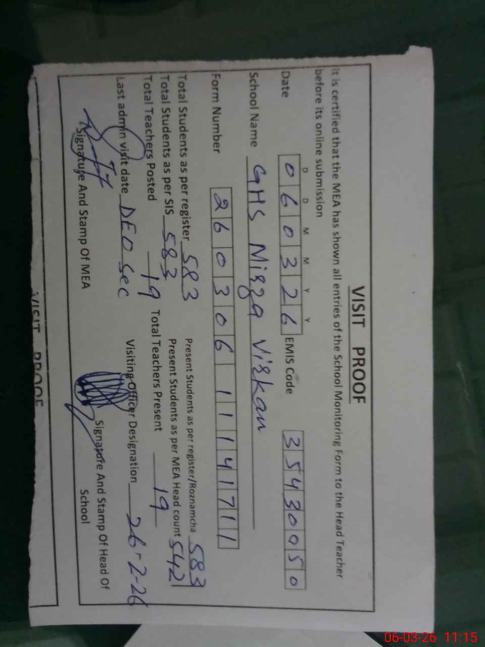 | Certified that this School was Inspected by the Undersigned MEA/DMO Today and the Information Stated Above is as Per Record. | |||||