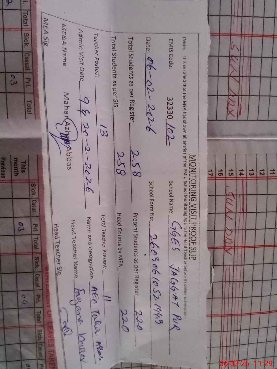 | Attendance Register | Head Teacher | MEA with School | Visit Proof |
