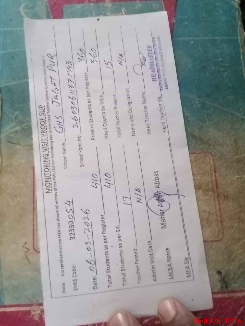 | Attendance Register | Head Teacher | MEA with School | Visit Proof |