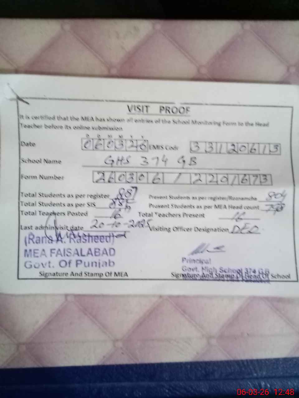 | EMIS Code: 33120613 | Name of School: GHS CHAK 374 GB | |||