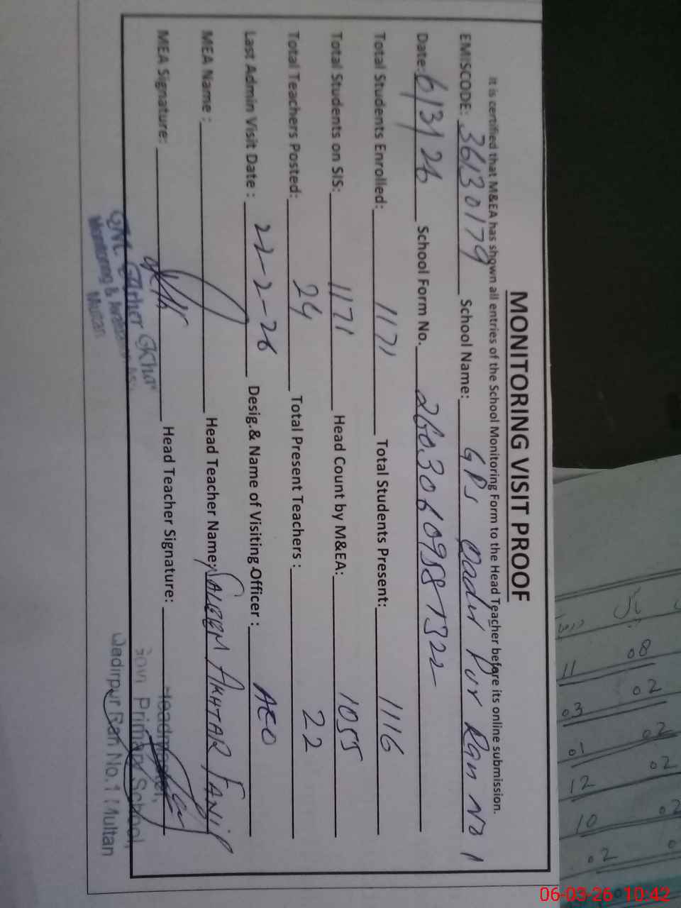 | EMIS Code: 36130179 | Name of School: GPS QADIR PUR RAN NO. 1 MULTAN | |||