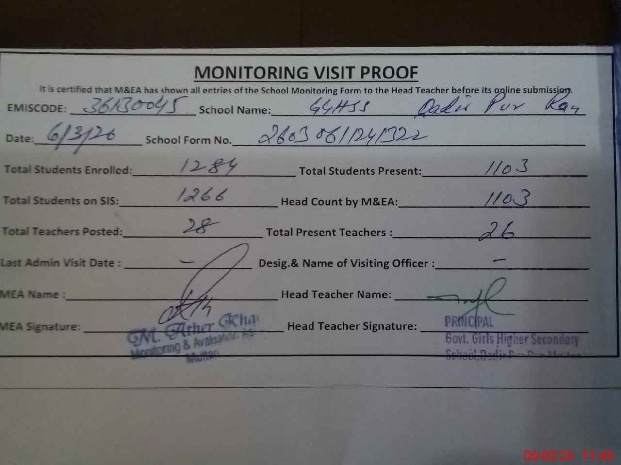 | Attendance Register | Head Teacher | MEA with School | Visit Proof |