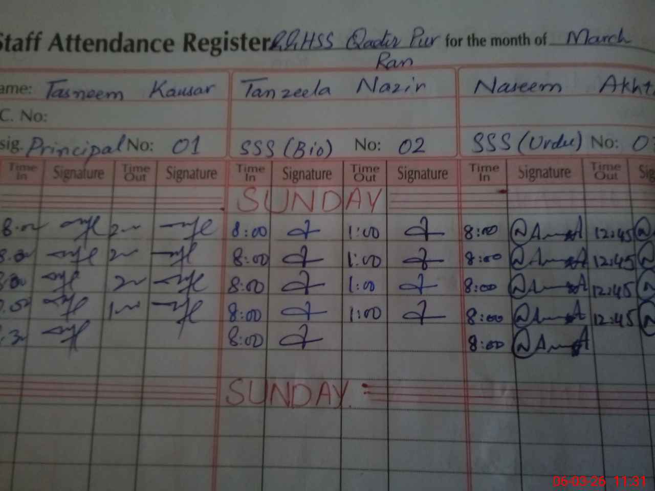 | CNIC | Full Name | Designation | R/C | Absence During Last Calender Month |