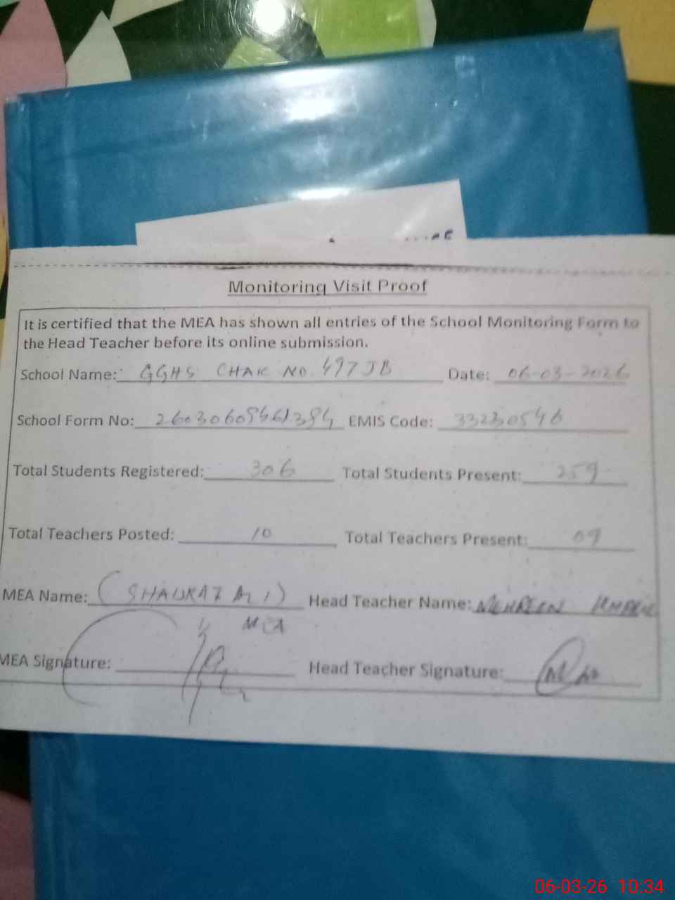 | Attendance Register | Head Teacher | MEA with School | Visit Proof |