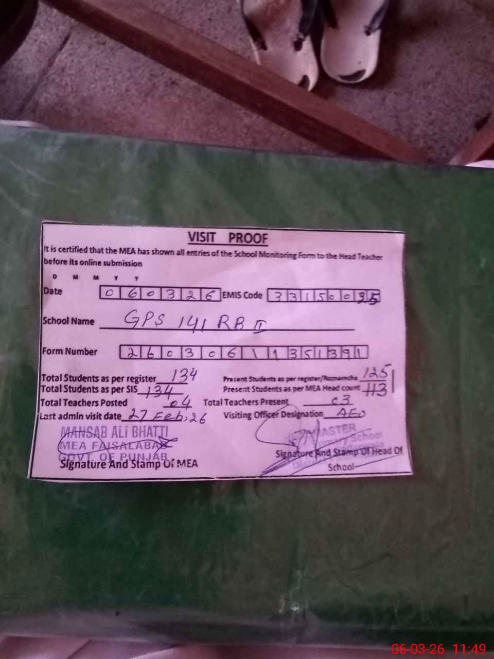 | Attendance Register | Head Teacher | MEA with School | Visit Proof |