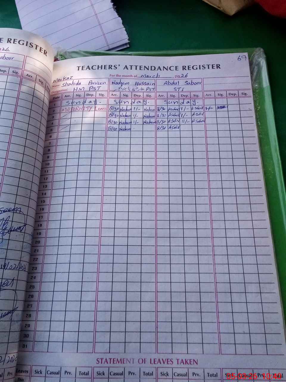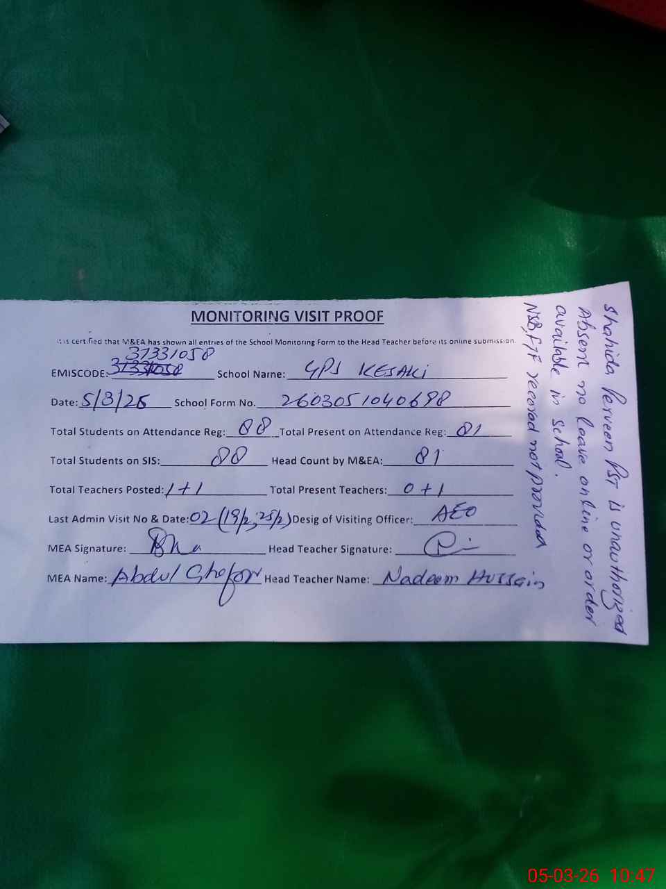 | Remarks (Use Separate Page if Required): NSB record not provided FTF record not provided Shahida Perveen is unauthorized absent no aproved leave online or order available in school | |||||